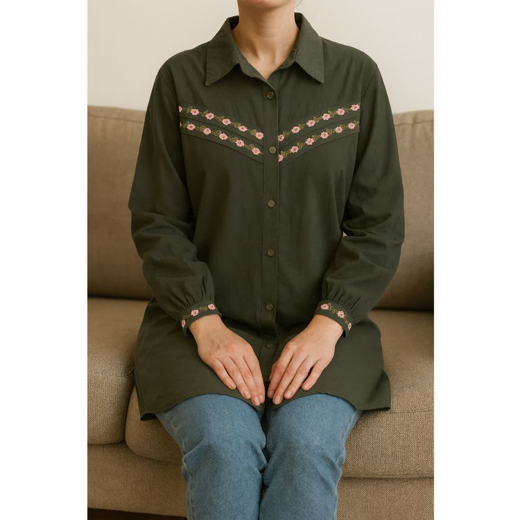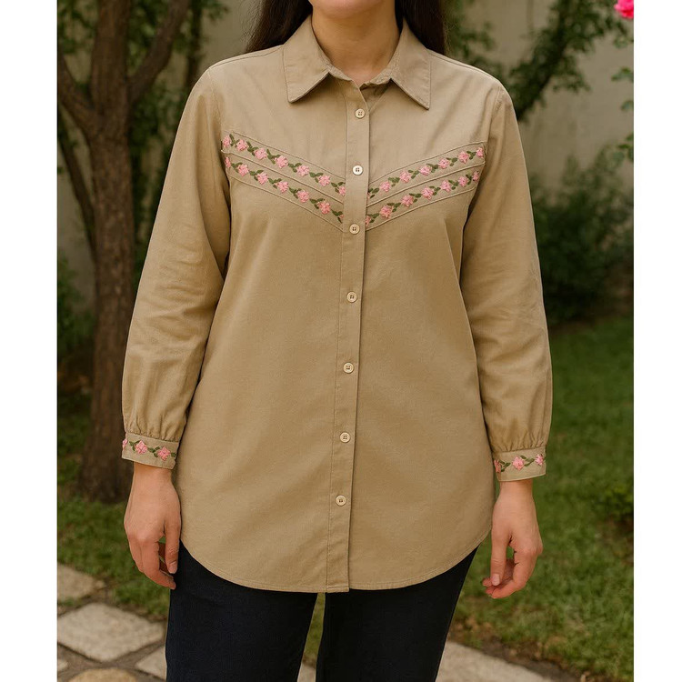 طراحی اختصاصی: گلدوزیهای متقارن و زیبا در قسمت سینه و سرآستینها که جلوهای خاص به آن بخشیده است.