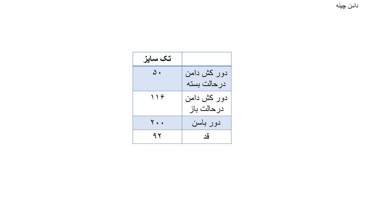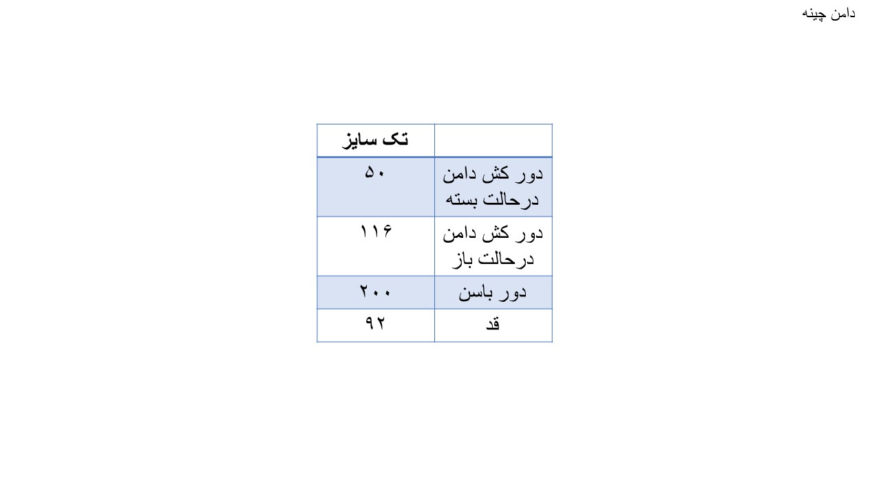 مثل همیشه جدول اندازه های محصولآخرین اسلاید هست و مهمترین بخش کمر دامن هست که در حالت کشیده ار دور باسن شما نباید کوچکتر باشه و در حالت کش بسته از دور کمر شما نباید بزرگتر باشد.