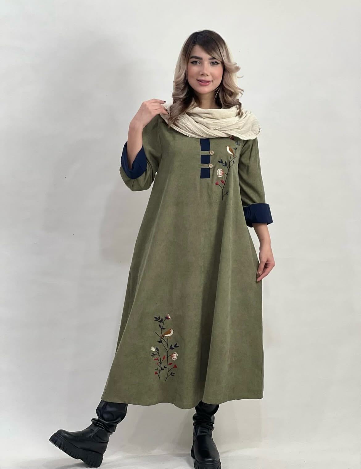 جنس مخمل کبریتی، بالا و پایین کفتان گلدوزی شده است. رنگبندی موجود است.