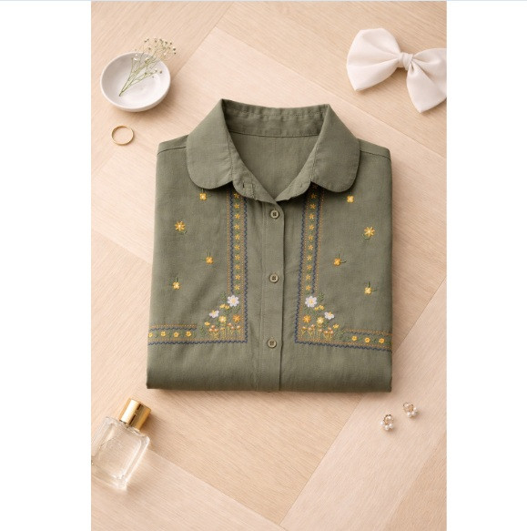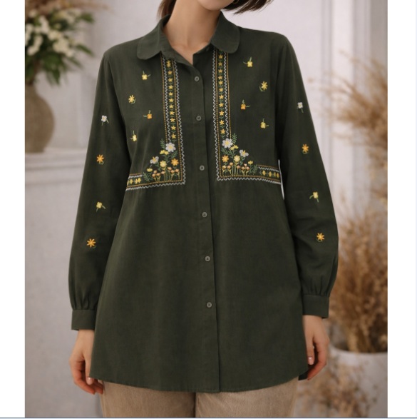طراحی اختصاصی: گلدوزیهای متقارن و زیبا در قسمت سینه و سرآستینها که جلوهای خاص به رنگ سبز زیتونی آن بخشیده است.