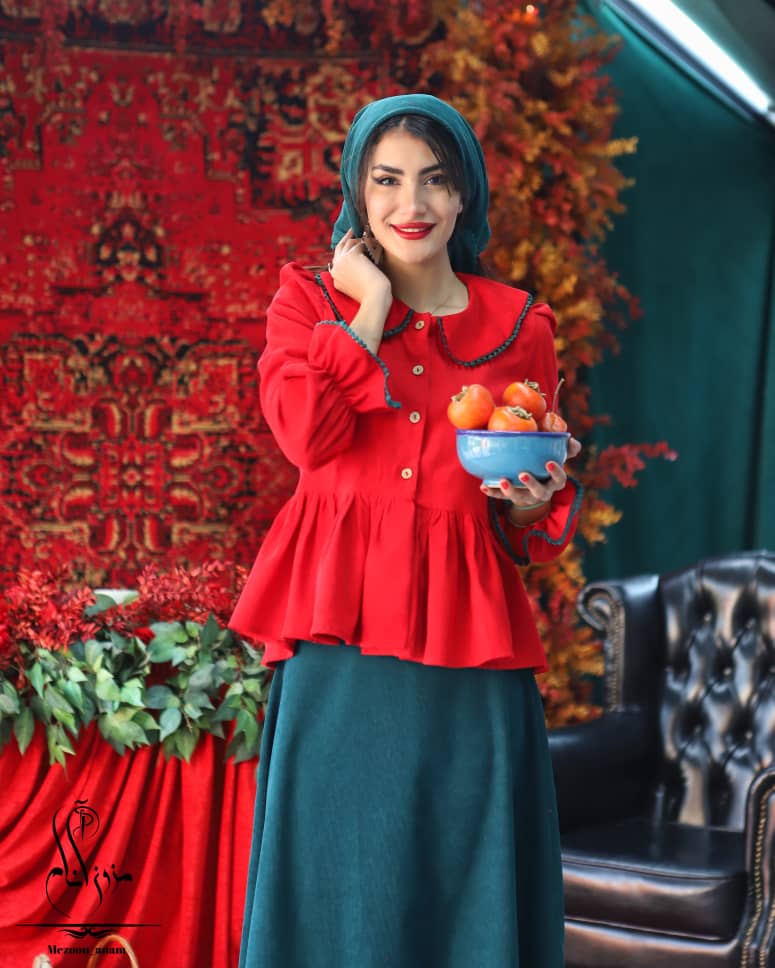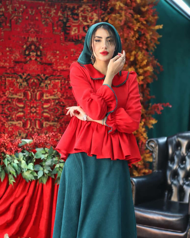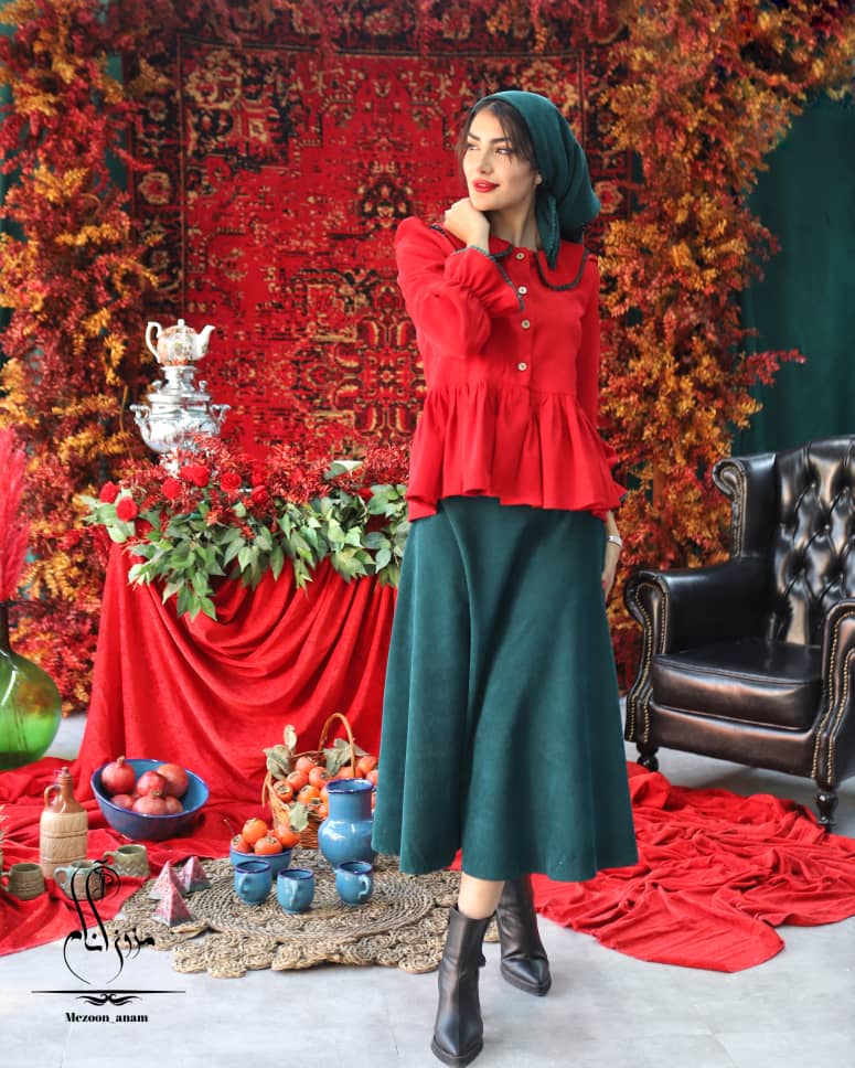 شومیز قرمز اناری و دامن سبز کله غازی هستش